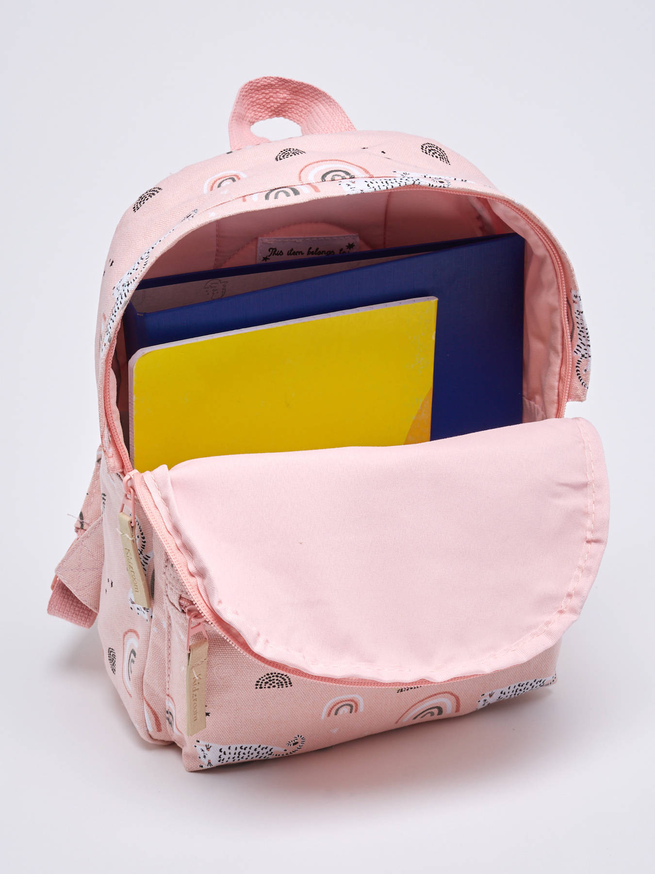 30 cm - 4 liters - 0.22 kg ~ It's impossible not to melt in front of this Kidzroom backpack made from a cotton blend and decorated with rainbows and felines. This 30 cm backpack is ideal to accompany your child when he/she starts kindergarten. Inside the main zipped compartment, your child will be able to store a small 17 x 22 cm notebook and a comforter. His little snack can be slipped into the zip pocket on the front of the bag. In addition to being cute and practical, this Kidzroom backpack is comfortable to wear thanks to its reinforced back and adjustable straps.