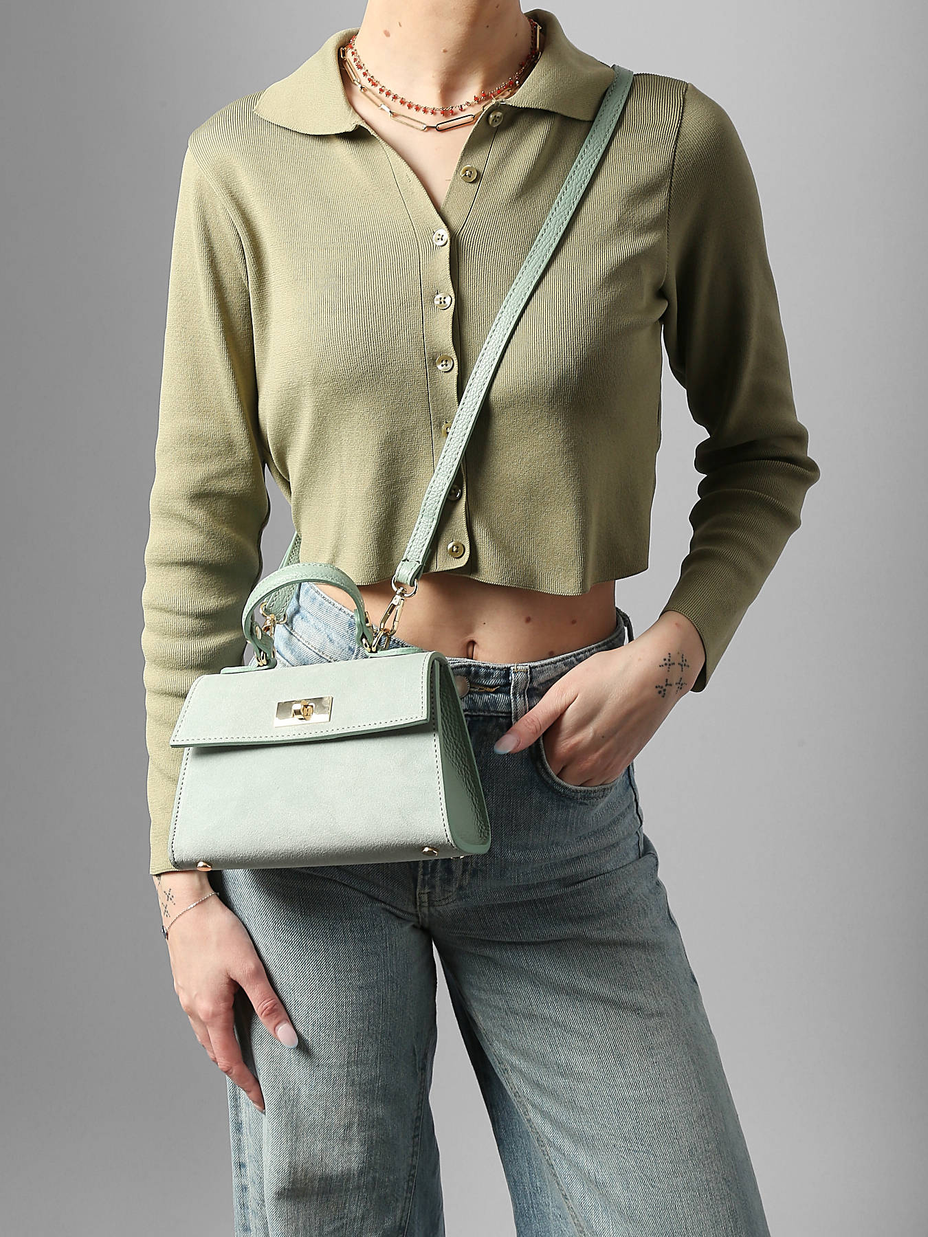 The VELVET CAVIAR MILANO shoulder bag, crafted from high-quality cowhide leather, combines elegance, modernity, and practicality for everyday outings or special occasions. Its refined exterior features a secure clasp, protecting your belongings while adding a chic and sophisticated touch. The 9 cm handle, together with the adjustable and removable strap, allows versatile wear by hand or crossbody, according to your needs and preferences. Inside, one main compartment is complemented by a zip pocket, providing organized space for your essentials such as your phone, wallet, and small necessary accessories. Compact yet functional, this model stands out for its elegant lines and premium leather, providing both durability and refinement. The VELVET CAVIAR MILANO bag is a chic and practical accessory, perfect for enhancing your looks with style and sophistication.